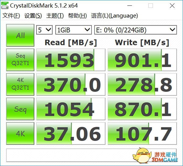 凭借PCI-E接口的支持,在CDM测试中,铁甲战将PCI-E AIC SSD的连续读取速度达到1593MB/s,连续写入速度达到901MB/s,强劲表现一览无余。