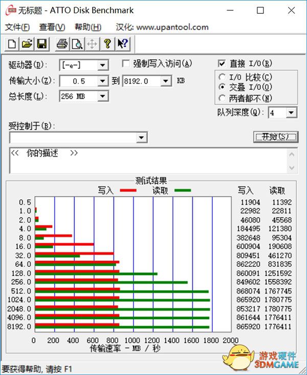 ATTO的测试结果也十分惊喜。1776MB/s的连续读取速度和865MB/s的连续写入速度,足够说明铁甲战将PCI-E AIC SSD的优秀。