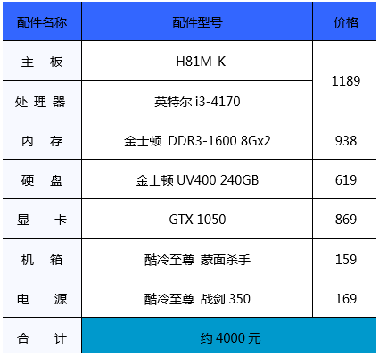 那么对于新装机的用户,最近有装机计划的朋友可以参考一下以下配置,虽然价格只有不足4000元,但是对于市面上的主流游戏都可以游刃有余。并且,大牌云集,对品质也是最好的保证。想要吃经济适用鸡,这套配置足矣,当然预算再多一些可以换成i5处理器,速度会更快。