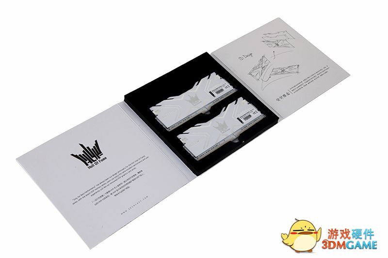 而第二面则介绍了产品灵感来源,设计师由激光剑取得灵感,整张内存由棱角分明的线条作为基础进行拼合延伸,再围绕HOF LOGO做出视觉延伸,用金属材质的外壳作为润色,体现出了HOF至尊、超频的内在精神。