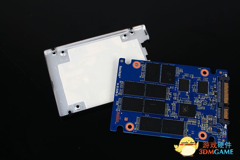 将芯片拆除,我们可以看到在金属壳和闪存颗粒之间有导热贴片来增强颗粒的散热,这是在很多盘上所没有的!电路板的主要颗粒和芯片都集中在一面,另外一面则是空的!可以在电路的角上看见sandisk的标志!