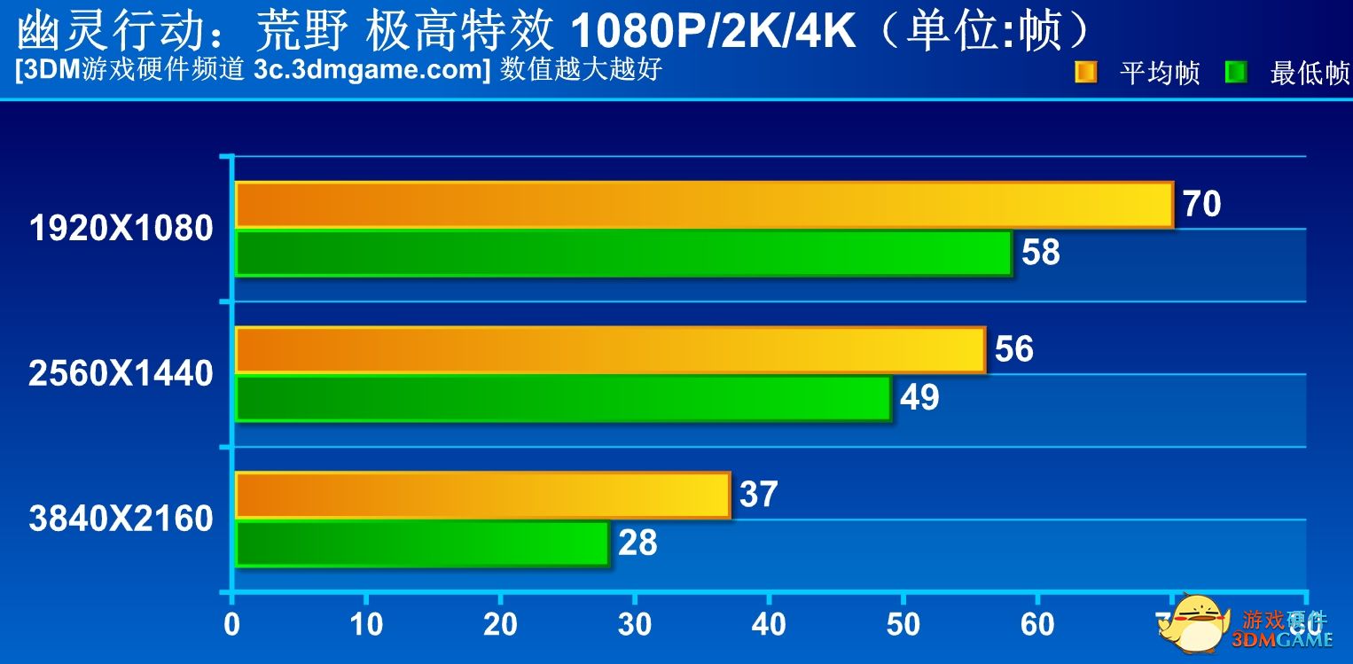 作为一款最新的游戏,也许是因为老黄家和苏妈家针对这款游戏的力度很高,也许是因为这款游戏本身对于游戏硬件的要求不高,在4K分辨率下的表现竟然达到了大部分时间都维持在40FPS之上!而2K分辨率下帧率直接突破了60帧流畅线,奔着更高的70帧而去!1080P分辨率下一举突破了100帧!