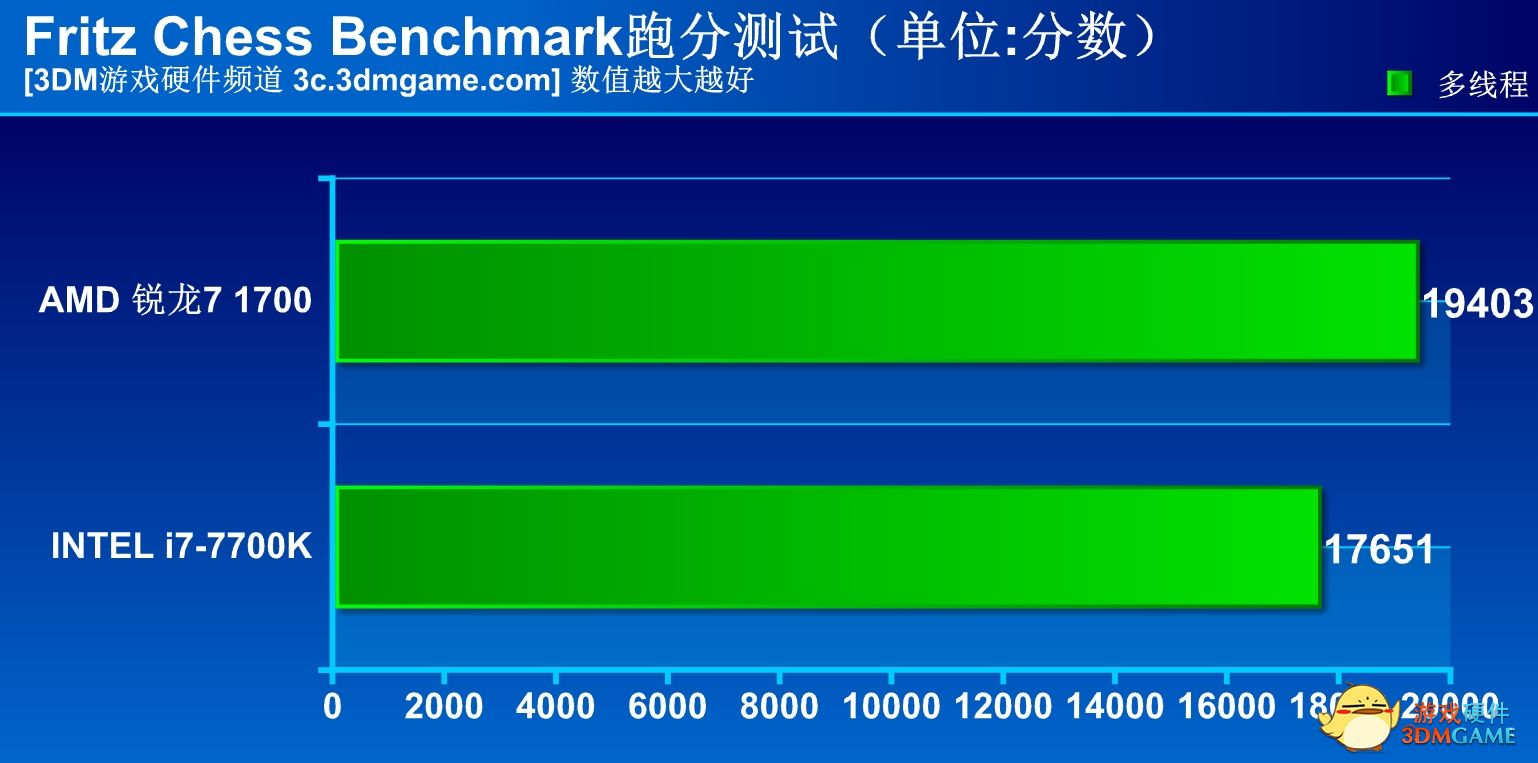 通过国际象棋跑分我们可以最为直观的看出两款CPU的性能差,可以看到,在多线程跑分当中,AMD 锐龙7 1700的表现相当出色,在售价比7700K更低的情况下性能方面完虐后者。
