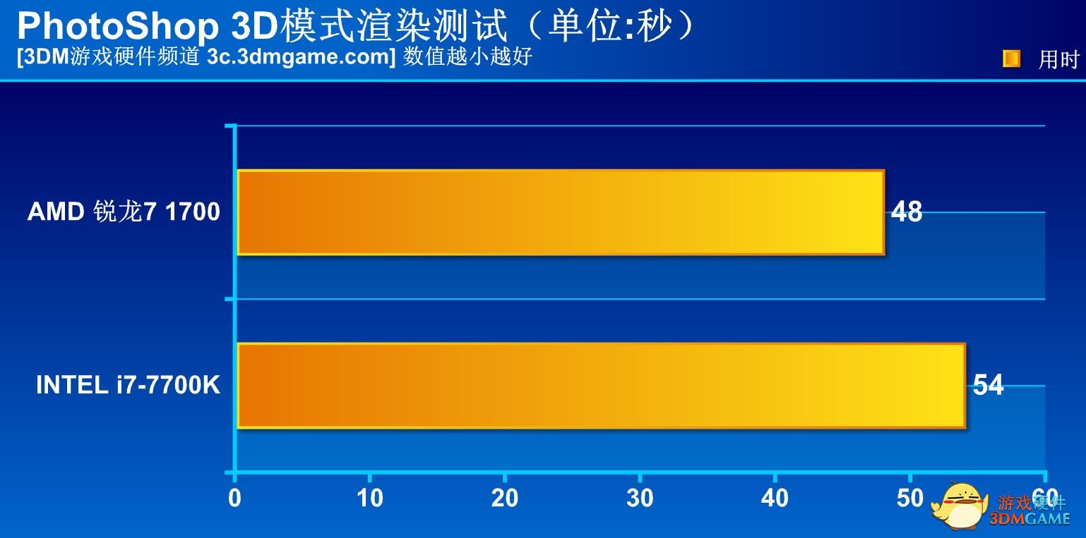 AMD 锐龙7 1700在这方面依然完胜7700K,在同一个文件渲染的时间AMD 锐龙7 1700比7700K少了11秒,而且文件越大,工程越复杂它们之间的差距也会越来越大,这就是多核心的好处!