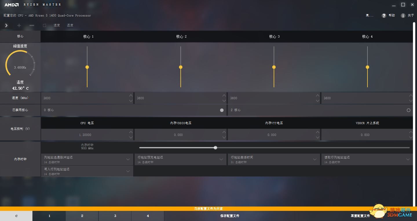 并且AMD 锐龙5 1400处理器的不锁倍频给了我们玩家更多的可玩性,AMD Master软件可以让我们不用进入BIOS就可以轻松调节电压和超频,可视化的窗口可以让玩家一次性的将要设置的数值提交应用,最直观的感受超频后锐龙CPU的暴力输出!