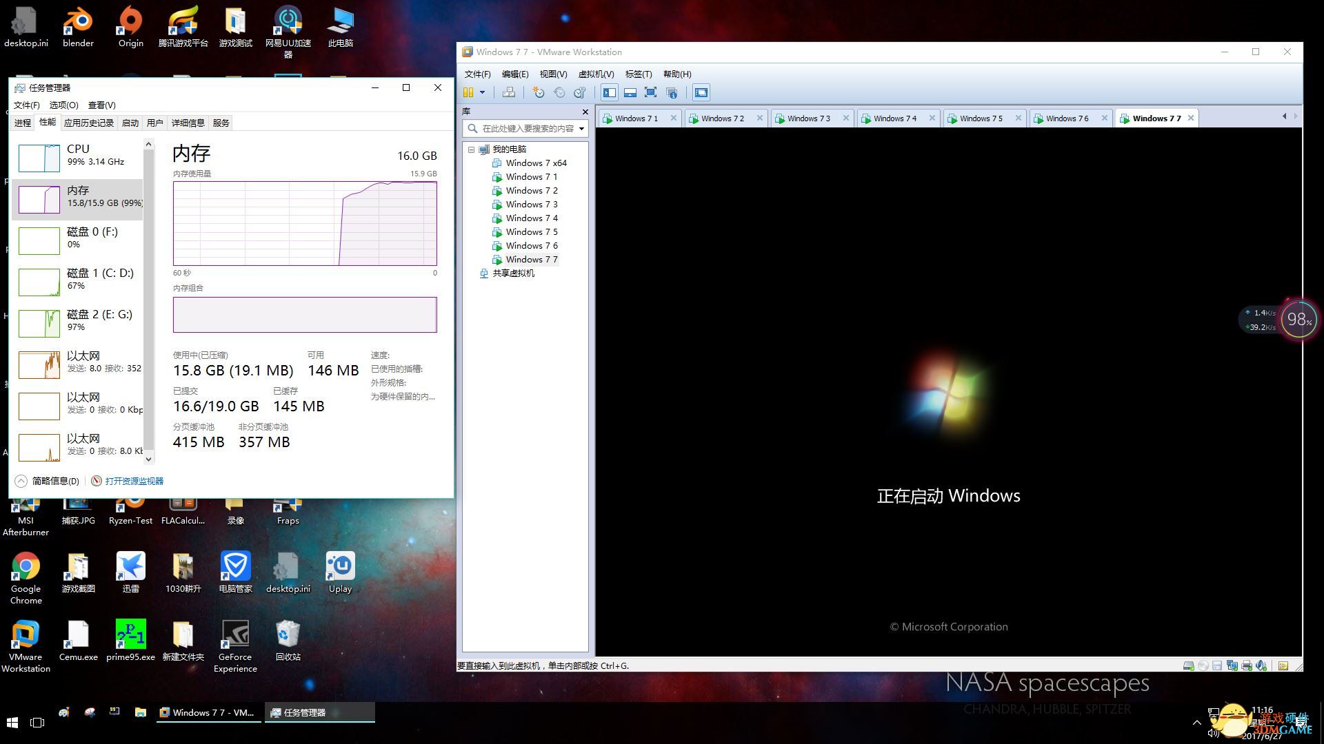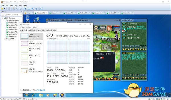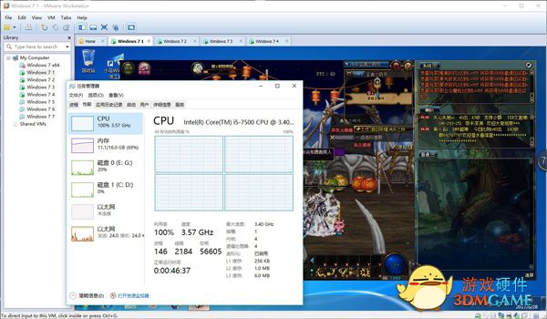 毕竟是一款配置要求极低的回合制网络游戏,7台WIN7系统的虚拟机每台运行一个梦幻西游,然后我们还在系统内运行一个,就是8开,两款CPU都可以完美胜任这个工作,开在实体系统中的大号仍然流畅,可以带着七台虚拟机内的小号刷各种副本!