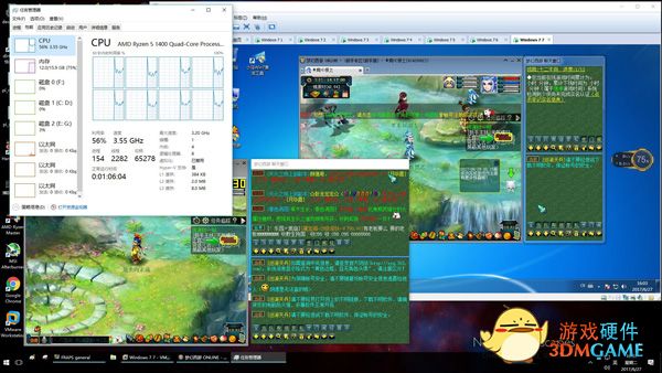 相比起梦幻西游的低配置要求,地下城与勇士这款游戏显然不是简单运算就能应付的了,i5-7500 CPU在7开虚拟机和1开实体机的情况下直接就无法打开游戏了,游戏卡顿在进入界面黑屏无响应,让我们无法进行测试,所以我们降低了对这颗4核心4线程CPU的要求,只开了4路虚拟机,这才顺利的打开游戏!
