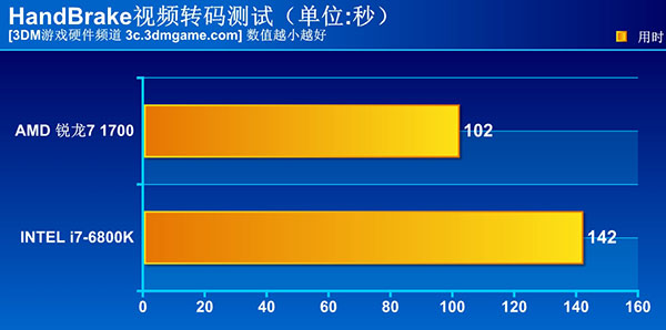 同样是一场差距非常悬殊的比拼,AMD 锐龙7 1700处理器完胜INTEL i7-6800K,如果我们需要转码的视频文件越多,则它们之间的差距会越来越大!可以给视频转码工作者节约多少个日日夜夜!在多核大趋势的今天,选择一个多核性能好的CPU是多么的重要!