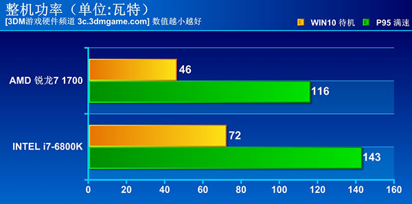 通过上图我们可以看到AMD 锐龙7 1700处理器和INTEL i7-6800K的功耗情况,在空载状态下,锐龙7 1700处理器的待机功耗只有46瓦特,而INTEL i7-6800K却有72瓦特,简直就是电老虎,看来说X99平台费电果然不是盖的!