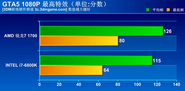 由于游戏场景会切换,最低帧并没有什么参考价值,所以不作为参考依据!但是从平均帧上来看,AMD 锐龙7 1700处理器在游戏性能的发挥上碾压了6800K,凭借多核多线程将显卡的性能发挥到了极致!我们可以看到AMD 锐龙7 1700处理器甩了对手十多帧,这如果是在分辨率高的情况下可是非常容易区分出差别的差距!