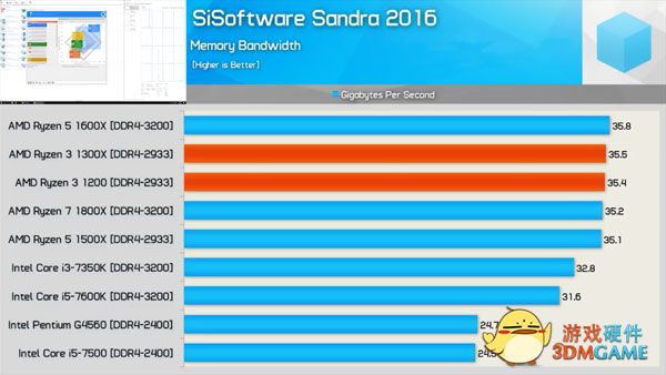 首先是SiSoftware Sandra 2016的内存带宽测试,惊喜还是有的,两款锐龙3的内存带宽和锐龙5系列完全一致,把i5、i3和奔腾G4560统统碾压在脚下。不过内存带宽的高低和实际性能的高低并没有多大的正比例关系。