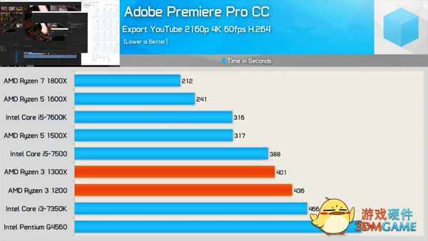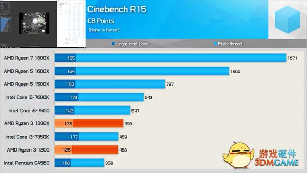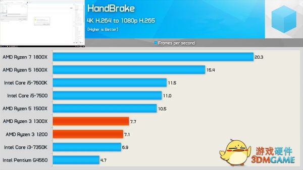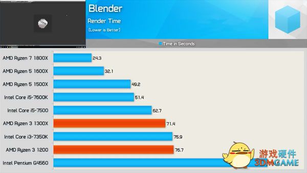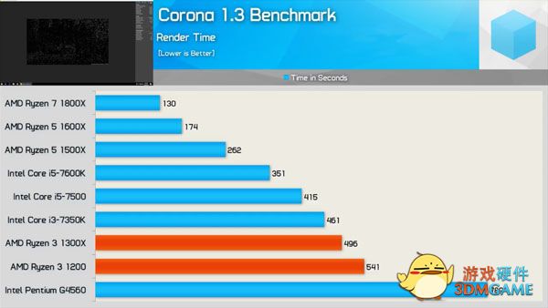接下来是关于制图渲染性能的Cinebench R15的对比,结果也很清晰,真四核的成绩完胜假四核的酷睿i3-7350k和奔腾G4560,值得一提的是,i3-7350K的基础频率高达4.2GHz,单核性能成绩甚至把自家的i5-7600K给秒了,然后这是一个吃核心的测试。另外值得一看的是锐龙3 1300X的成绩,多线程性能和i5-7500差距不到10%,然后目前i5-7500的售价区间在1100~1400附近。锐龙3全系列也是不锁频的,按照锐龙5和锐龙7的体质,玩家到手后超频到3.8GHz左右应该是很轻松的,战平i5-7500是相当轻松。