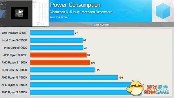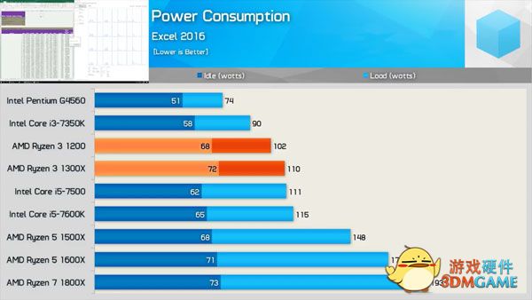 整机功耗方面,锐龙3 1200/1300X会比i3-7350K稍高,在Excel 2016的对比测试中,待机状态下约10~12瓦,负载情况下约12~20瓦,能耗水平和i5-7500看齐。在Cinebench R15的全核心全负载下,锐龙3 1200只比i5-7500高出6瓦,比锐龙5 1500X低了近55瓦!(编者注:哥觉得,锐龙3虽然是由原生八核阉割而来,但其中四核心应该同在一簇CCX模块中,全速功耗才会比锐龙5 1500X低这么多)