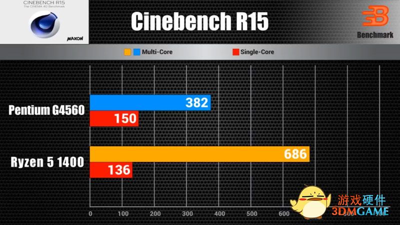 首先来看看办公性能的对比,Cinebench R15的渲染对比,多线程成绩锐龙5 1400毫无悬念的大幅领先约80%!