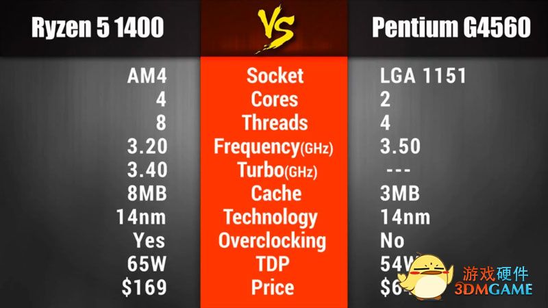 从CPU的参数对比来看,锐龙5 1400是完全压制,四核八线程默频3.2GHz,自动Turbo到3.4GHz。