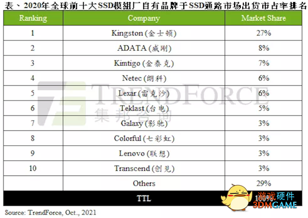 总的来看,2020年全渠道SSD出货较2019年衰退15%,为1.115块。前三大品牌依然是金士顿、威刚和金泰克。