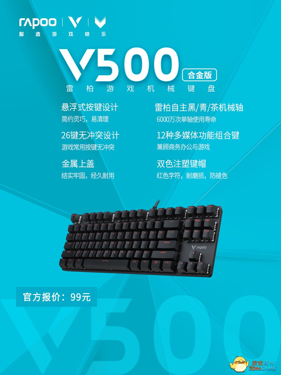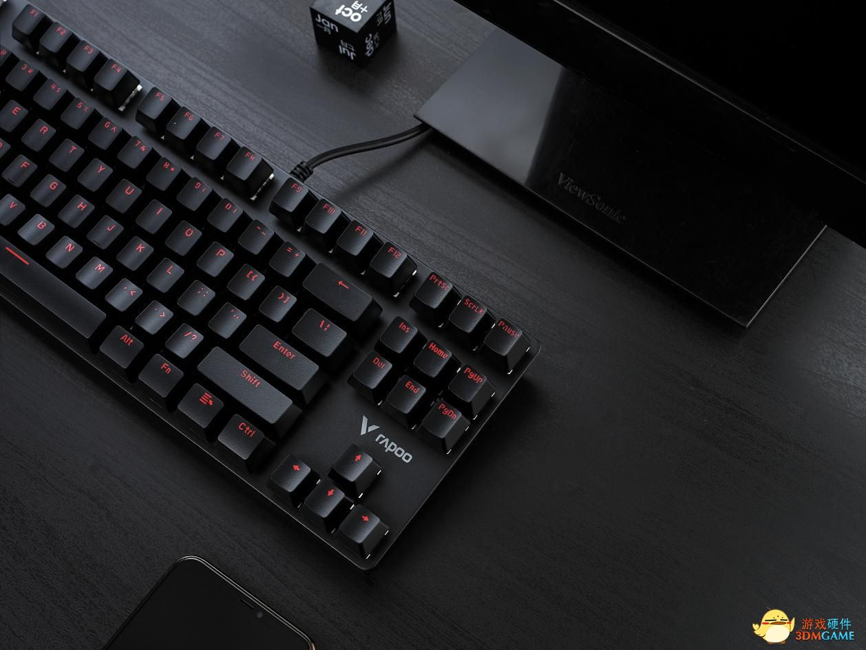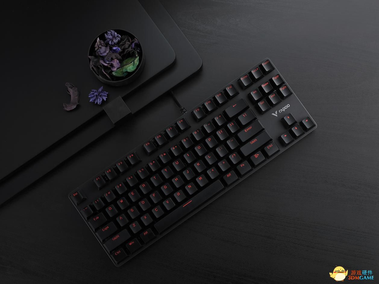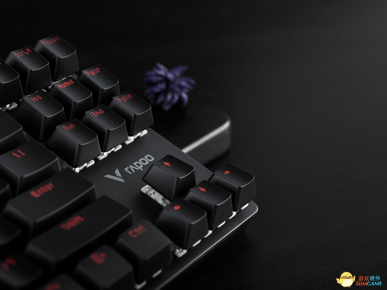 雷柏V500合金版采用标准的87键设计,金属上盖配以红色字符的黑色悬浮键帽,窄边框设计使得玩家有更多操作的空间。