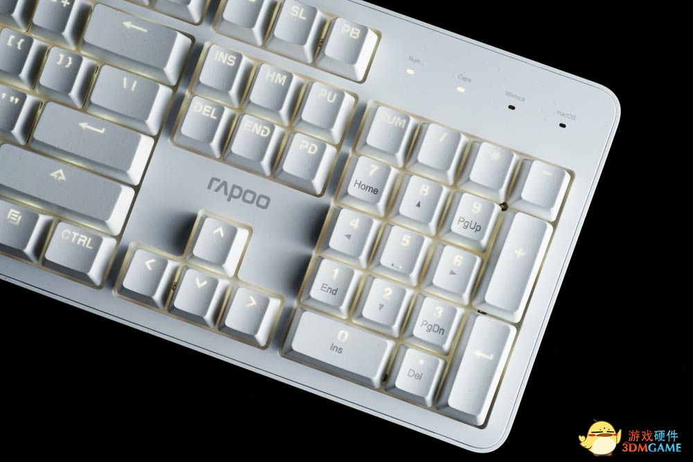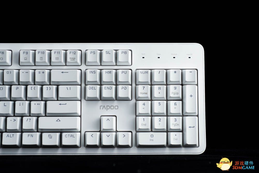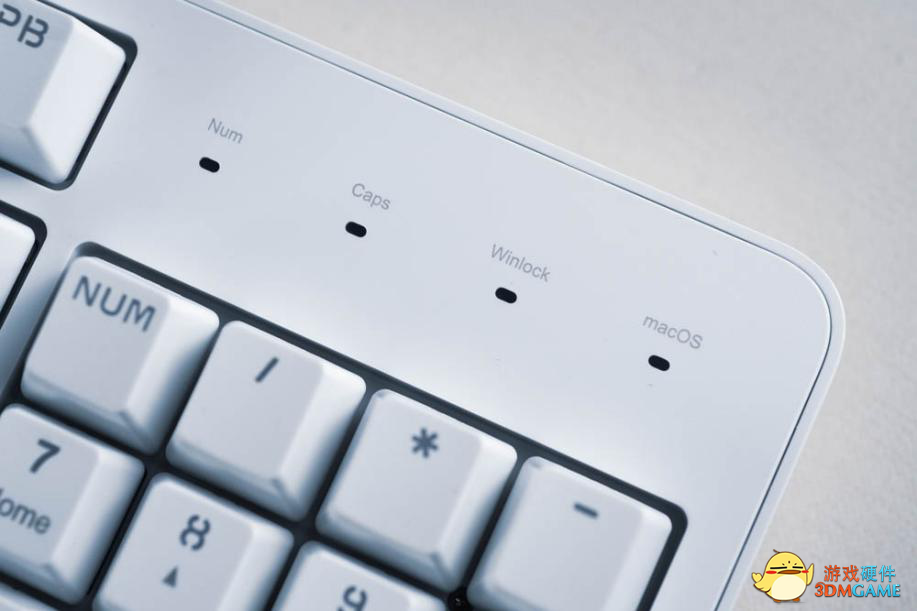 在键盘的右上角分布了四颗指示灯,用来显示小键盘锁定、大小写锁定以及Windows系统和MacOS的使用模式。
