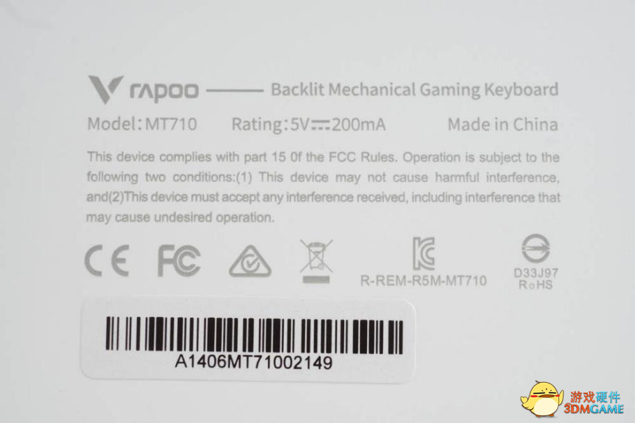 雷柏MT710机械键盘整体重量为1070g,产品尺寸为446*137*32.8mm,这个尺寸在机械键盘中算是中规中矩。背光仅支持白色背光,工作电压为4.75-5.25V,最大工作电流为200mA。