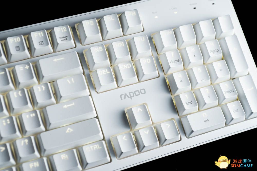 雷柏MT710机械键盘使用白色背光,透过键帽均匀释放出,且支持四档亮度调节,但是只有常亮一种灯光模式,可以通过FN+↑|↓键来调节大小,如果不喜欢的话可以选择关闭。